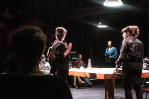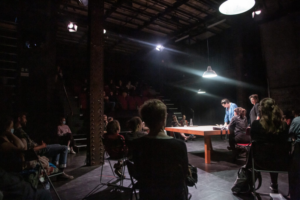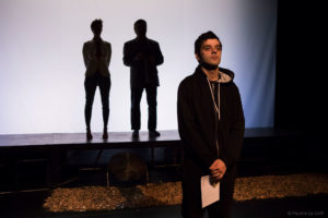 Depuis quelques temps, je souhaite expérimenter une forme théâtrale discursive. M’appuyer davantage sur le texte et les méandres de la pensée. Faire un spectacle qui parle, nous fait penser et nous donne envie d’en parler ensuite. Faire cela sans les artifices que nous convoquons habituellement pour faire spectacle. C’est vraiment le désir de convoquer ici un théâtre brut, s’appuyant sur des épreuves rhétoriques.