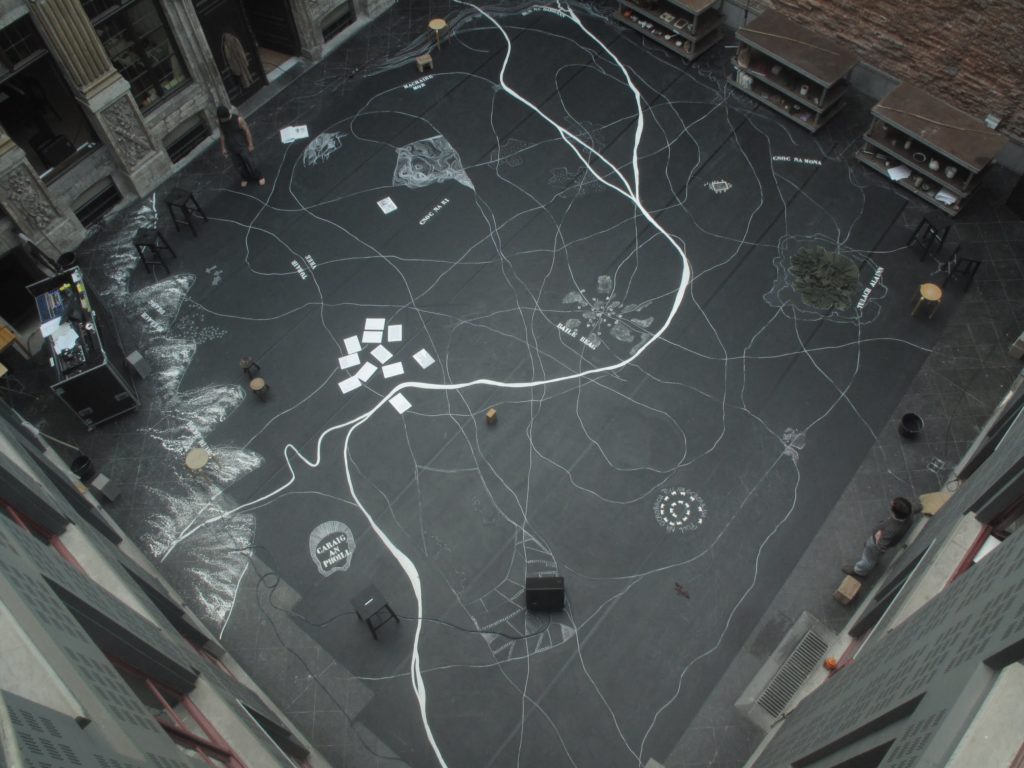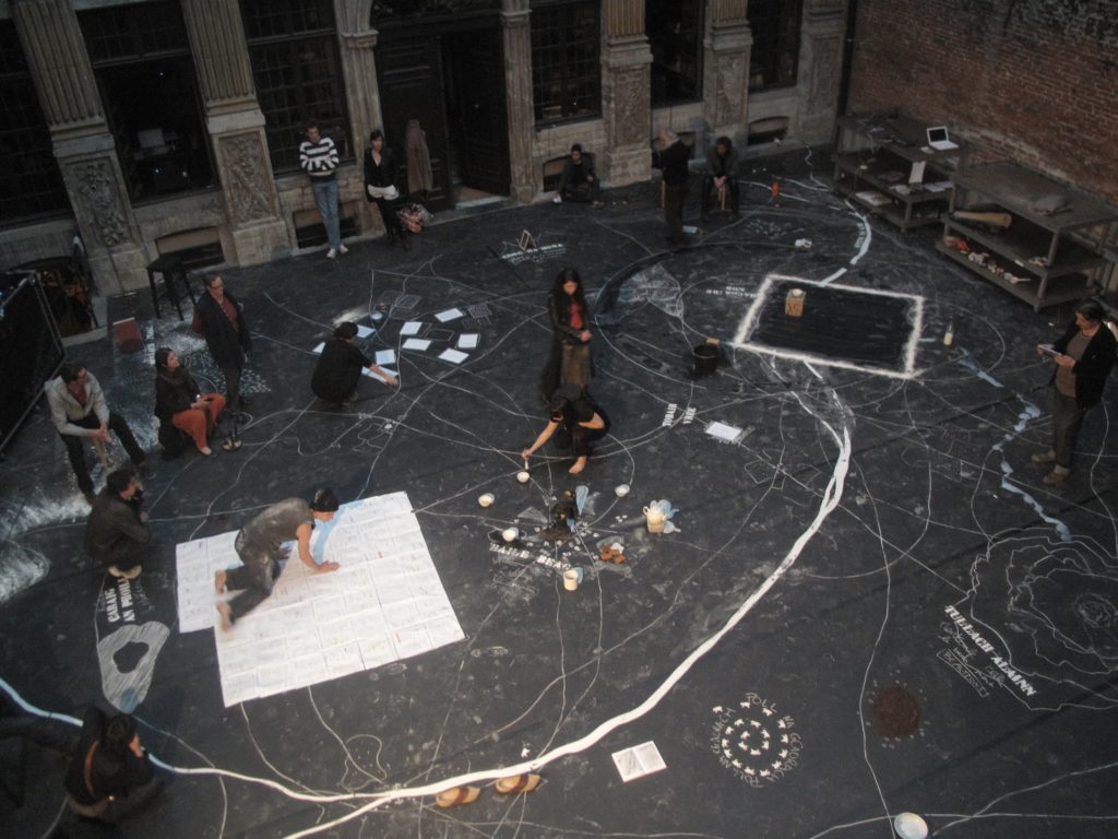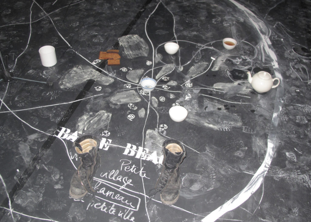 Comme un laboratoire de chercheurs ou d’archéologues, comme les ouvriers du drame de Valère Novarina, nous déployons la carte d’une pièce, et observons ses éléments. Des fils apparaissent et construisent un nouveau territoire. A partir de Translations de Brian Friel, Terrain est la tentative de se trouver au carrefour de l’exposition et du théâtre, la mise en commun d’un espace qui n’est plus propriété des acteurs mais se laisse boulverser par les corps des invités.